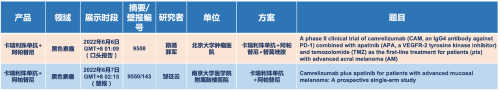 在黑色素瘤领域,OD体育的卡瑞利珠单抗联合阿帕替尼(“双艾”组合)在2022 ASCO共入选1项口头报告和1项壁报展示。