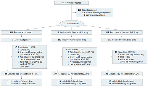 本研究共336例12-75岁的中重度AD患者符合纳入排除标准并接受随机分至硫酸艾玛昔替尼片4 mg组(n=113)、硫酸艾玛昔替尼片8 mg组(n=112)或安慰剂组(n=111)。