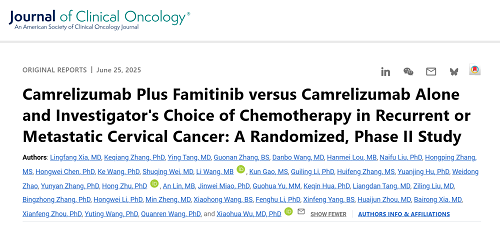 [1]Xia L, Zhang K, Tang Y, et al. Camrelizumab Plus Famitinib versus Camrelizumab Alone and Investigator's Choice of Chemotherapy in Recurrent or Metastatic Cervical Cancer: A Randomized, Phase II Study. J Clin Oncol. Published online June 25, 2025.