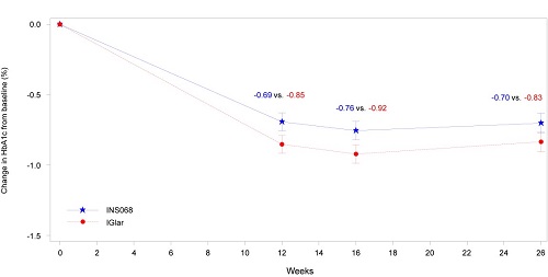本研究达到预设的主要终点,治疗26周后,INS068组的HbA1c相对基线变化非劣于IGlar组。INS068组与IGlar组的HbA1c降幅分别为0.70%和0.83%,两组差值为 0.13%(95% CI:-0.05,0.31)。