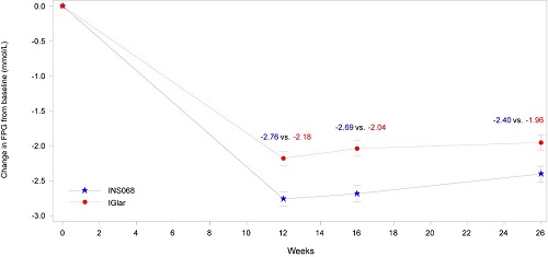 治疗26周后,INS068组FPG降幅大于IGlar组(均值变化:-2.40 mmol/L vs -1.96 mmol/L;两组差值:-0.45 mmol/L,95% CI:-0.74,-0.16)。