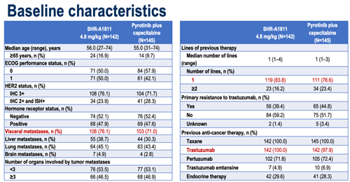 从2022年8月4日到2024年8月9日,共287例符合条件的患者入组。截至2025年6月30日,瑞康曲妥珠单抗组的中位随访时间为15.9个月(95%CI:14.6-17.1),吡咯替尼联合卡培他滨组的中位随访时间为15.3个月(95%CI:14.3-16.6)。73.5%的患者存在内脏转移,34.5%的患者存在肝转移,44.3%的患者存在肺转移。接近100%的患者既往接受过曲妥珠单抗治疗,72.1%的患者既往接受过帕妥珠单抗治疗。